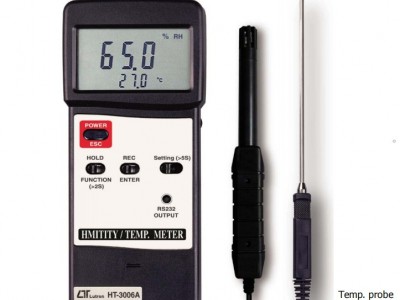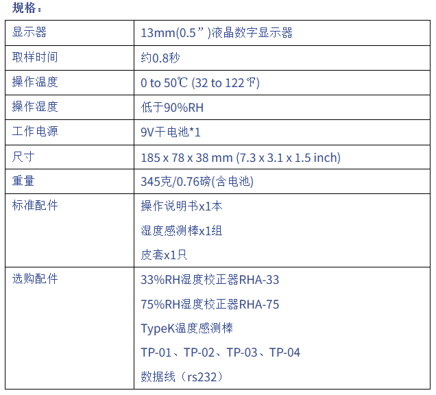 1.操作温度0-50℃2.最大值.最小值.平均值 记录3.DATA HOLD.4.SIZE:180x72x32mm5.10-95%RH ±3%±1%RH6.K type热电耦测温 –50-1230℃ ±1%±1℃7.可附加选购配件:1、RHA-33 33%RH湿度校正器2、RHA-75 75%RH湿度校正器
