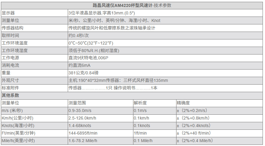 产品系数测量范围:0.9~35.0公尺/秒公尺/秒.英呎/分钟、公里/小时、Knot海浬/小时五种单位选择杯式风速传感器.测得较大风速可记录最大值/最小值功能、可手动纪录100点风速外壳防水IP65等级尺寸:190×40×32mm(三杯式)风杯直径135mm.